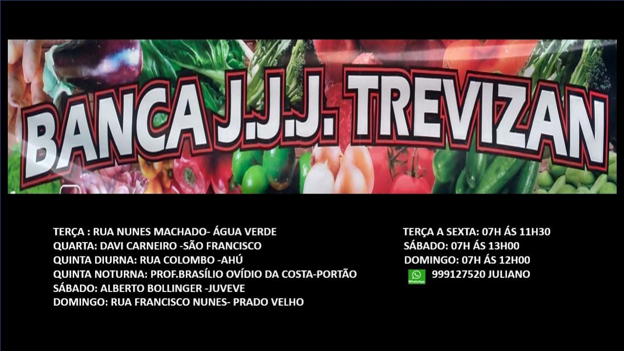 A Banca J.J.J Trevizan possui uma variedade de verduras e legumes fresquinhos de qualidade excelente. Não deixe de conferir nas Feiras Livres de Curitiba. Consulte disponibilidade de Delivery ou Retirada no Balcão. Dias de funcionamento *TERÇA: Rua Nunes Machado- ÁGUA VERDE (07h às 11h30); *QUARTA: Davi Carneiro -SÃO FRANCISCO(07h às 11h30); *QUINTA DIURNA: Rua Colombo -AHÚ (07h às 11h30); *QUINTA NOTURNA: Prof.Brasílio Ovídio da Costa -PORTÃO (14h às 21h); *SÁBADO: Alberto Bollinger-JUVEVÊ (07h às 13h); *DOMINGO: Rua São Francisco Nunes- PRADO VELHO (07h às 12h).
